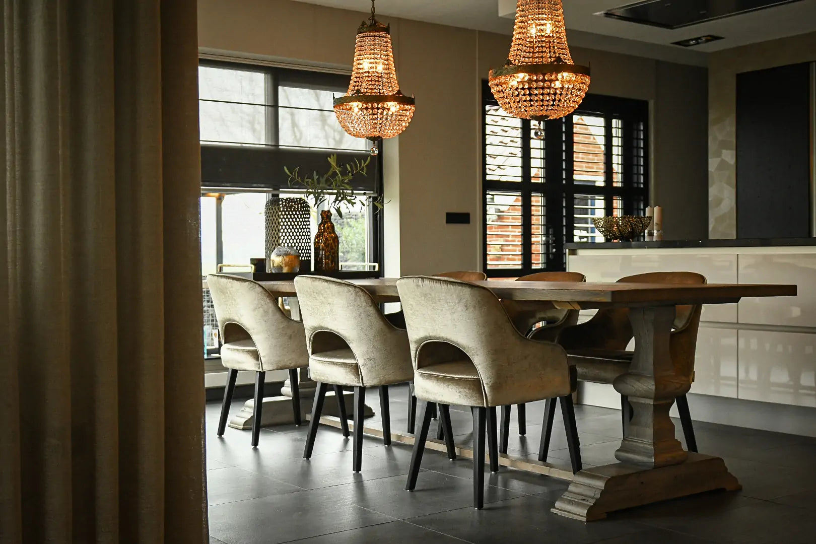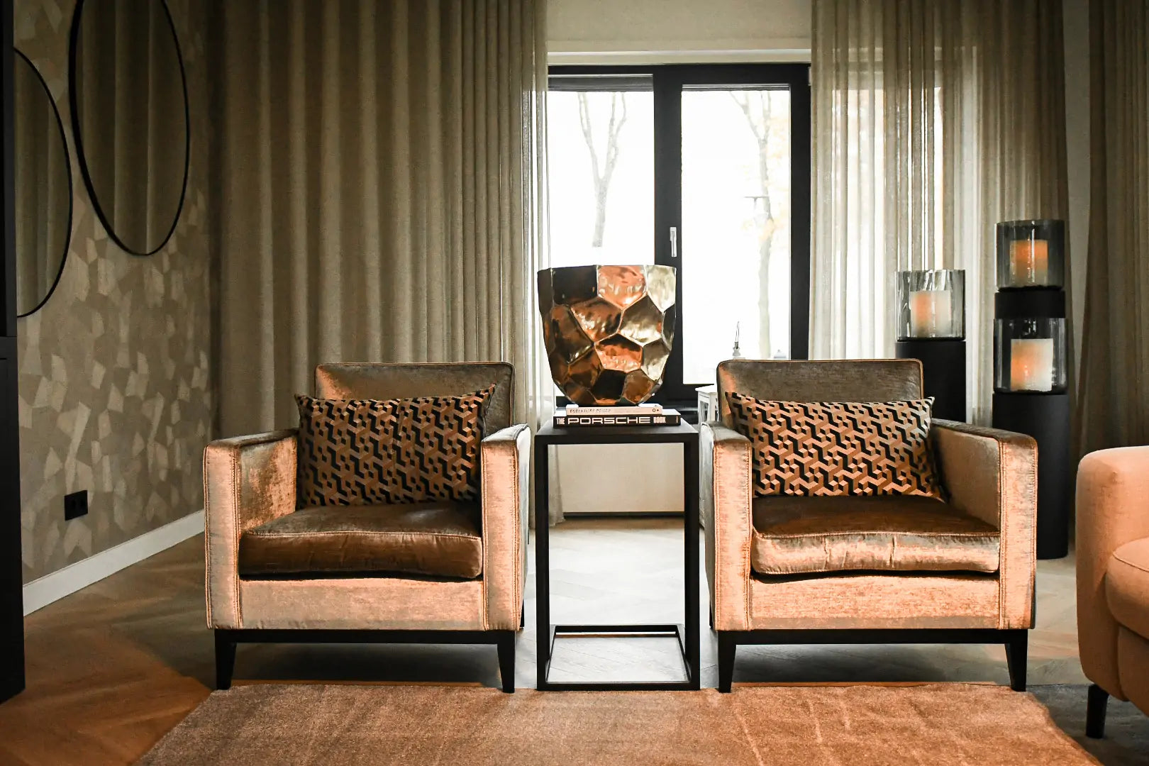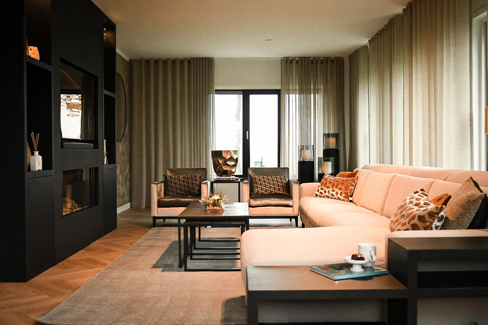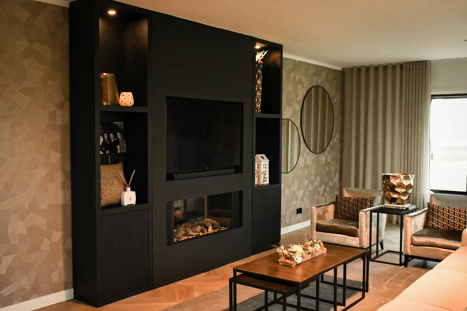 Eine Besonderheit dieses Projekts ist der Wandschrank mit Kamin. Diese Kombination aus Funktionalität und Design macht das Interieur einzigartig. Der schlichte und moderne Stil, kombiniert mit der luxuriösen Optik, schafft eine stimmungsvolle Atmosphäre im Haus.