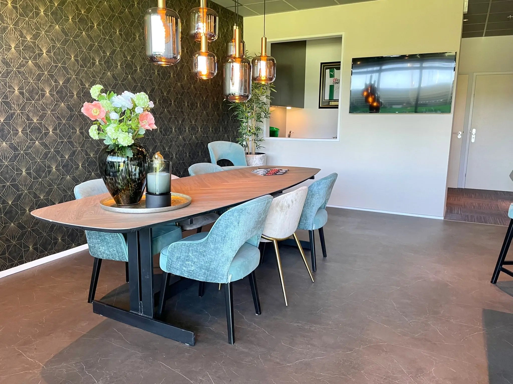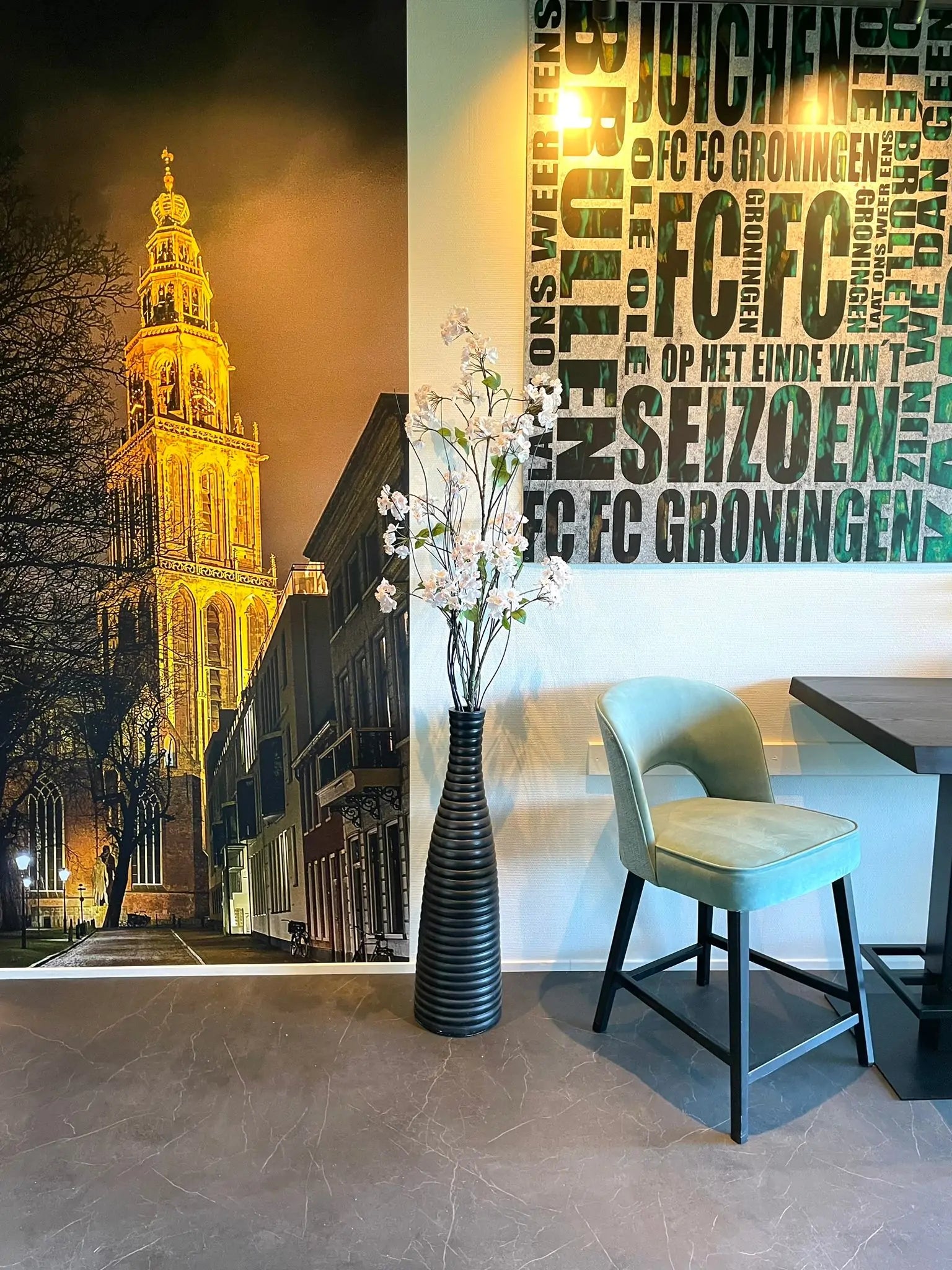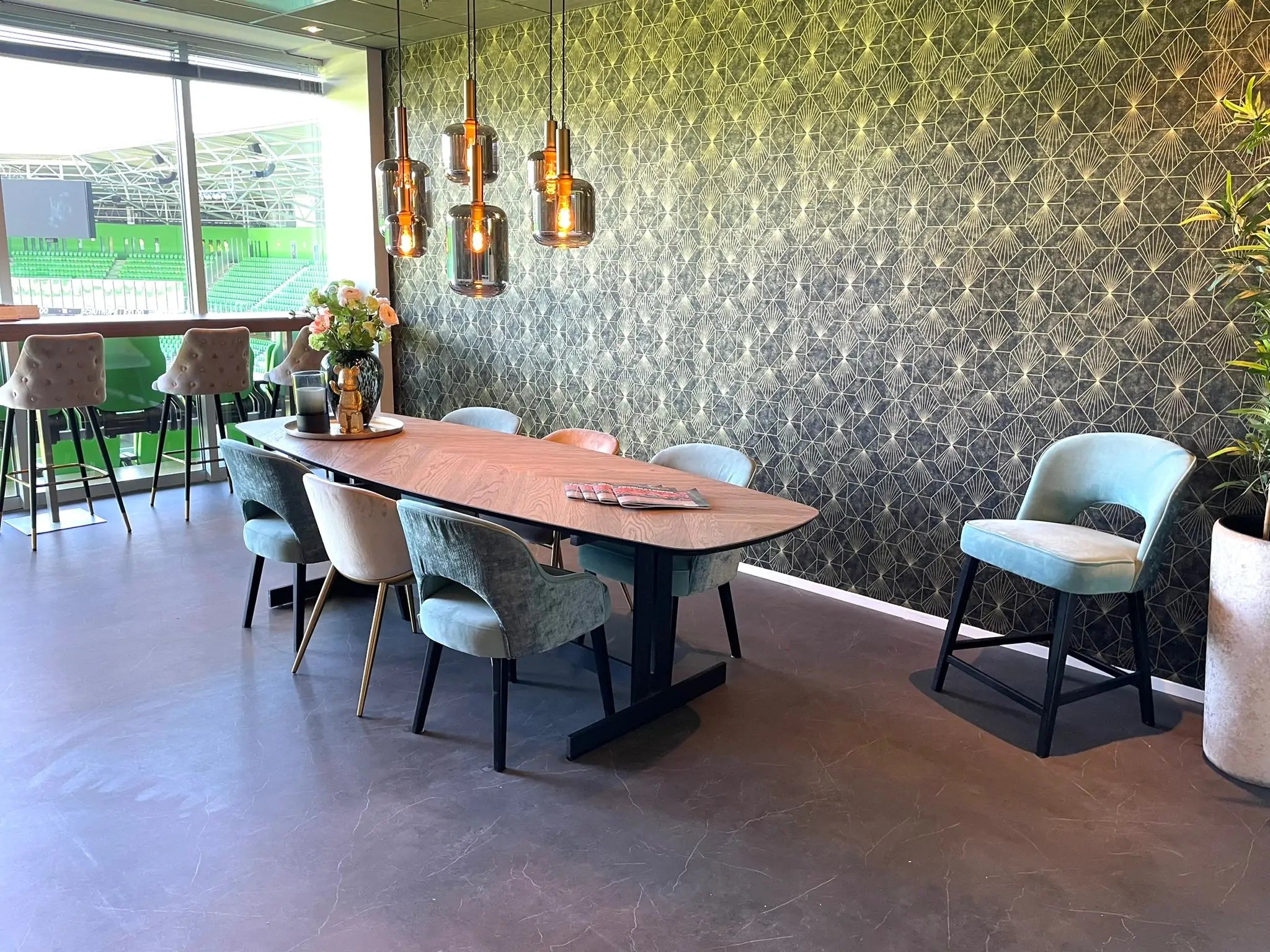 Für unser jüngstes Projekt haben wir die Inneneinrichtung einer gemeinsamen Skybox in Groningen realisiert. Es ist ein einzigartiger Raum, in dem verschiedene Unternehmer und Fachleute zusammenkommen. Unsere Aufgabe war es, dieser Skybox ein warmes und sachliches Aussehen zu verleihen, mit besonderem Augenmerk auf die Farbe Grün des FC Groningen.